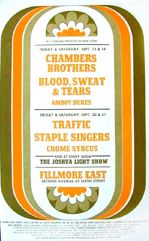 The Chambers Brothers,Blood, Sweat and Tears,The Amboy Dukes,Traffic,The Staple Singers,Crome Syrcus,Joshua Light Show at the Fillmore East, New York September 13th 1968.