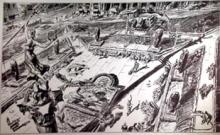 Illustration of square in San Francisco w/ statue of woman carrying pitchfork
