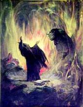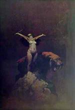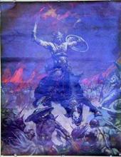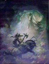 Frank Frazetta poster of a warrior on a horse confronted by a woman with bear
