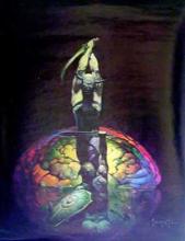 Frank Frazetta poster of two demon guys fighting with a glowing brain-like thing behind them