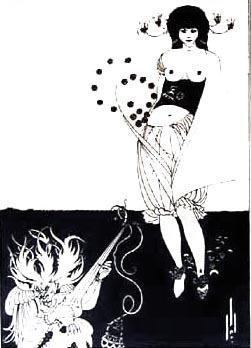 This is an illustration from a set that A.B. did for the play Salome It depicts Salome's mother with the head of John the Baptist.