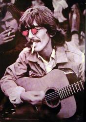 Rare shot of George Harrison when he and his girlfriend at the time were tripping on acid on Haight street in San Francisco. He was asked by people on the street to play some songs. Supposedly they were done pretty badly and he was made fun of in the press (sad!)