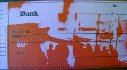 A checkbook-size version of an infamous Riot in Isla Vista, California in which a Bank of America was bombed! The protest was over the Chicago seven verdicts. The Chicago seven were defendants charged with conspiracy, inciting to riot and other charges related to violent protests that took place in Chicago, Illinois on the occasion of the 1968 Democratic National Convention.