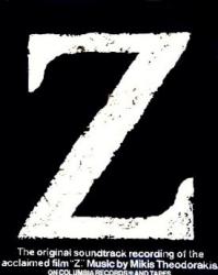 Ad poster for the soundtrack of the film "Z" directed by Costa-Gavras, starring Yves Montand and Irene Papas from 1969 about the assassination of a leftist deputy in Greece and the government cover up which followed. It is based on an actual historical event..