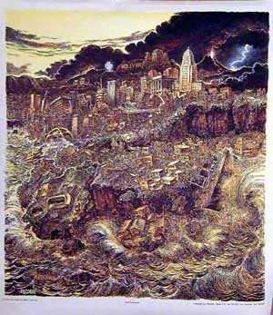 Illustration of Los Angeles being destroyed by a quake. Beautifully detailed poster by the famous 60’s artist Ron Cobb