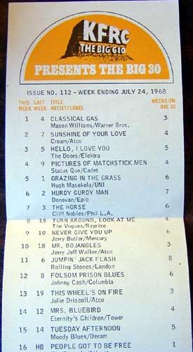 Top 30 song list from July 24th 1968.#1 was Classical Gas by Mason Williams.#3 Hello I love you by Doors.