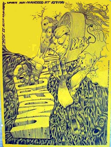 Underground KMPX is alive and well under San Francisco at 107 fm (printed on matte thick cardboard stock). This is an extremely rare promotional poster created in the late 60's or early 70's.