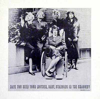 HAVE YOU SEEN YOUR MOTHER BABY, STANDING IN THE SHADOWS? This hilarious and a bit scary publicity poster of the Rolling Stones in drag was printed some time in the late 60's or early 70's although there is no copyright info printed. It is most likely an early bootleg.