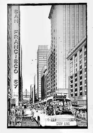 Illustration of hippies on tour bus looking at the business people downtown.